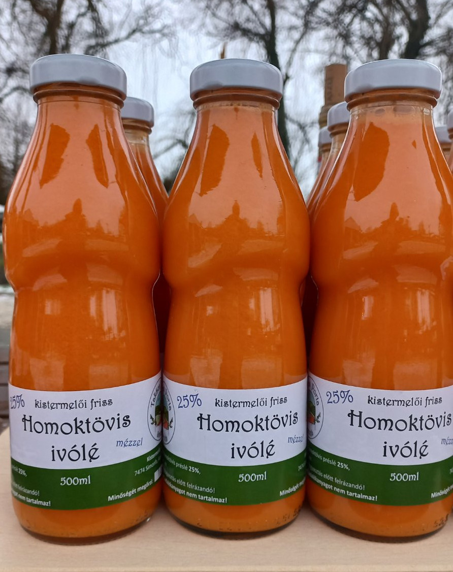 A fagyasztott gyümölcsből frissen préselt homoktövis levet helyi termelői mézzel édesítjük és vízzel higítjuk. Ez a termék nincs hőkezelve, ezért megmarad a magas antioxidáns és vitamintartalom. Frissen, csütörtökönként készítjük a terméket, mely 7 napig fogyasztható. Összetevők: homoktövis préslé 25%, termelői méz, víz Hűtve tárolandó! Fogyasztás előtt fel kell rázni, a rostok szétválása természetes folyamat! (nem tartalmaz emulgátorokat, homogenizáló adalékot)