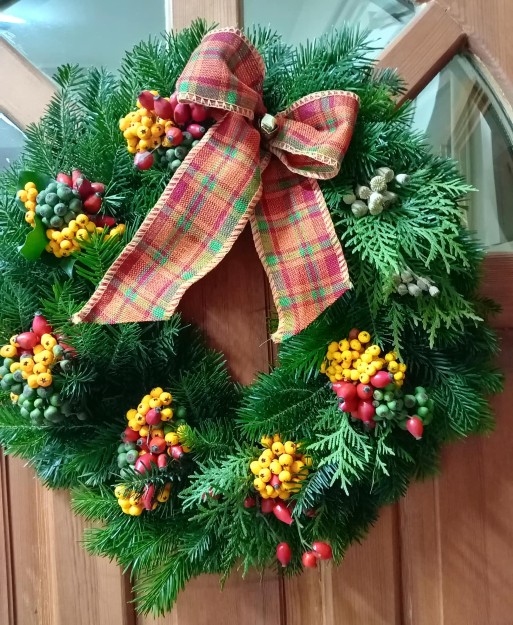 "kisebb" koszotú, csak 42 cm átmérőjű. Drót alapon, nordmann fenyő, borostyán, tűztövis, csipkebogyó és szárított pipacs terméssel díszítve.