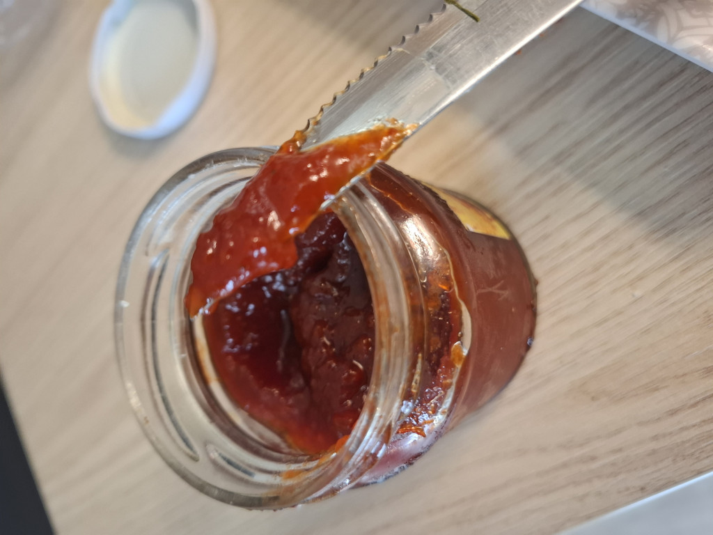 Édes Paprikalekvár. Pont olyan mint, az eperlekvár, csak ebben paprika van. Ebben variációban, 6 kg paprikához tettem, 1 liter alma ecetet, 1 kg nádcukrot, paradicsompürét, és 2 tasak dzsem fixet. Fogyasztható, reggelire, szendvicsekhez, vajas kenyérrel, zsíros kenyérrel, bundás kenyérrel. Sült húsokhoz. 2 dl kis befőttes üvegbe csomagolva. Jó étvágyat kívánok!