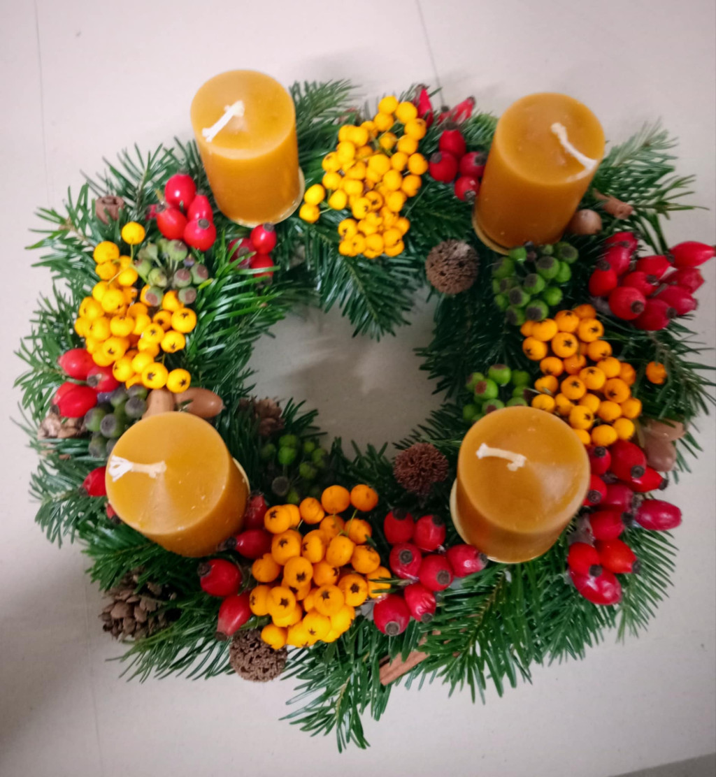 Adventi koszorú, színes bogyókkal, termésekkel díszítve, élő fenyőből, szalma koszorúalapon.
