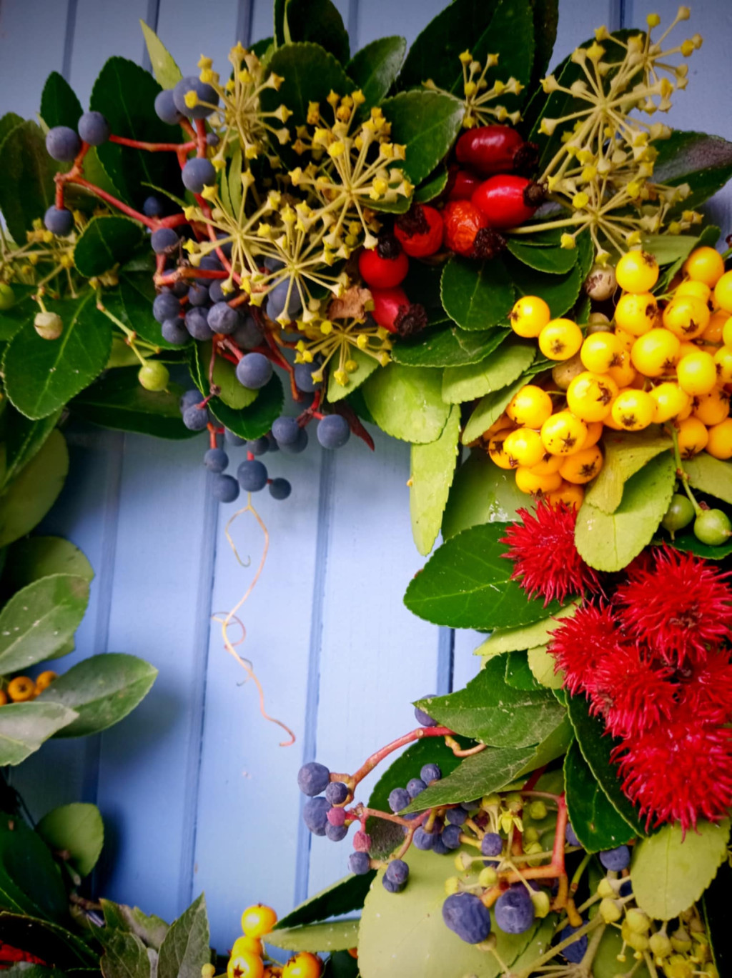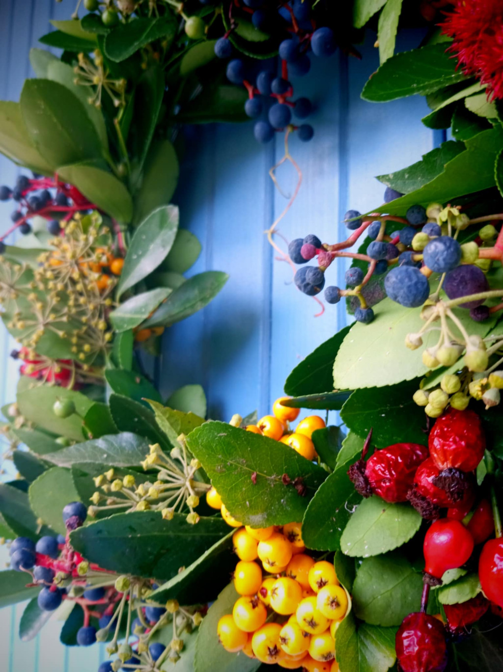 Színes, bogyókkal és termésekkel díszített koszorú, örökzöld alapon.