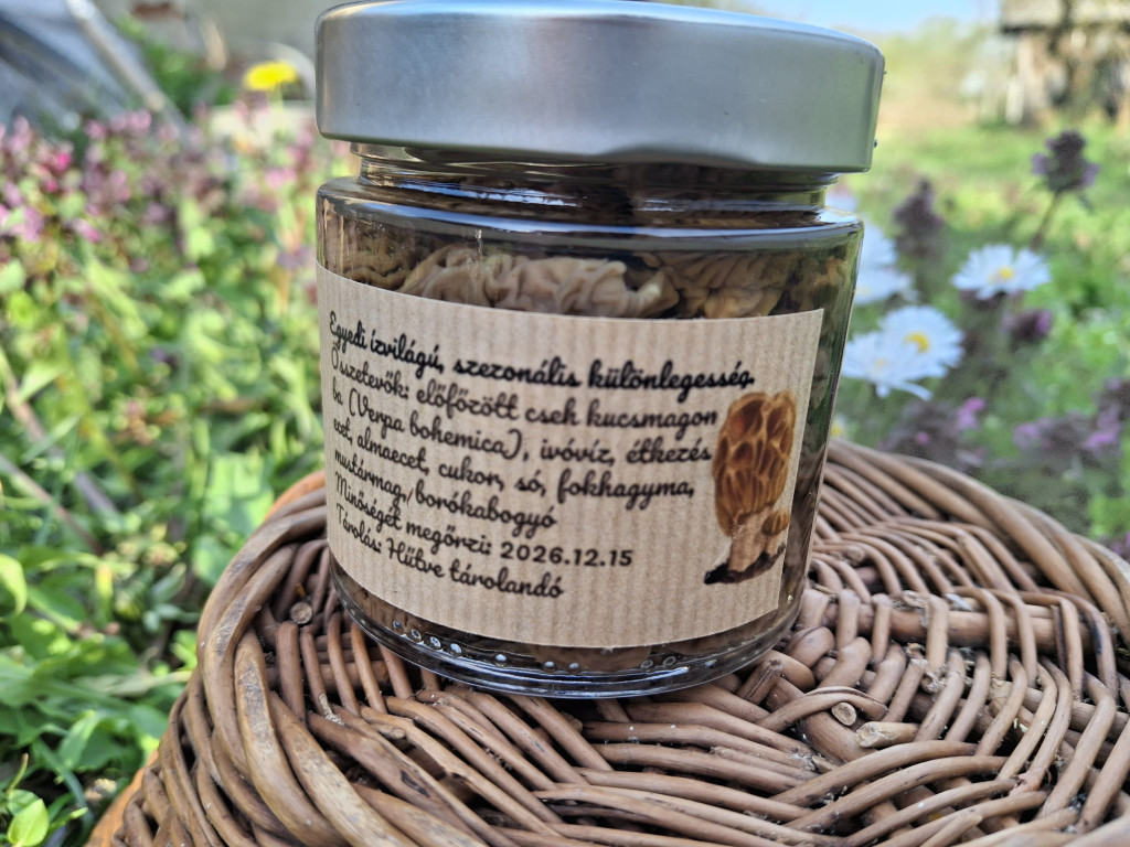 A tavasz egyik legritkább és legrövidebb ideig elérhető erdei gombáját hoztuk el ebben a különleges termékben. A gondosan válogatott, vadon gyűjtött cseh kucsmagombát előfőzzük, majd enyhén savanykás, fűszeres lében tesszük el, egy kevés almaecettel finomítva.