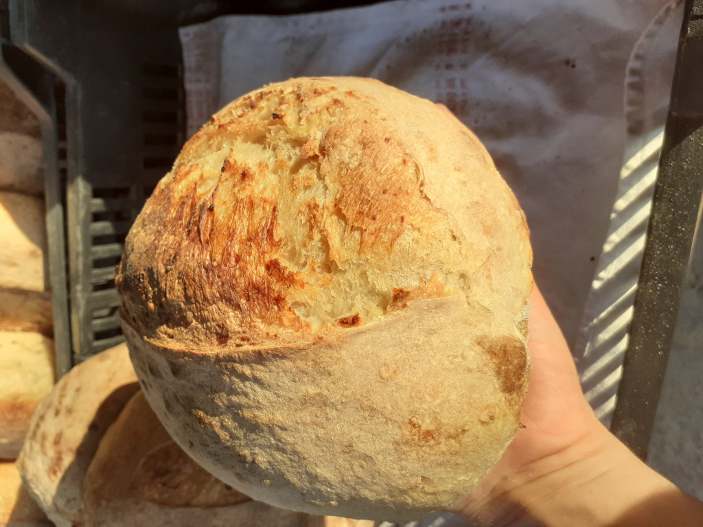 Kenyérlisztből készült vadkovászos békebeli vajaskifli. Összetevők: liszt, tej, vaj, cukor, só