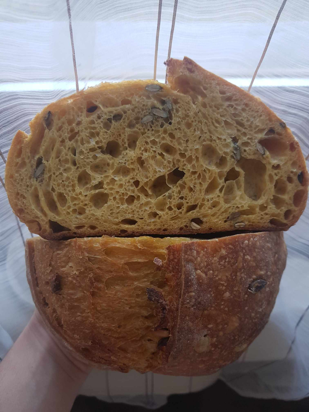 Kenyérlisztből készült vadkovászos békebeli vajaskifli. Összetevők: liszt, tej, vaj, cukor, só